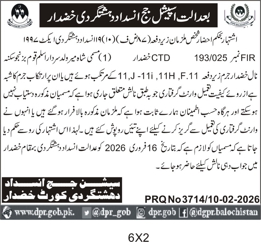 This notice from the Special Judge Anti-Terrorism Court in Khuzdar calls for the presence of individuals related to specific FIR cases for warrant execution and arrests. The department in Khuzdar requires the attendance of persons involved in FIR 193/025 CTD Khuzdar for legal proceedings under anti-terrorism laws.
