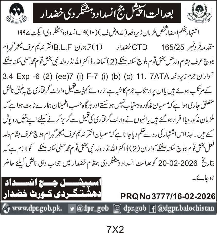 ποΈ Issuing Authority:Special Judge Anti-Terrorism Court Khuzdar
