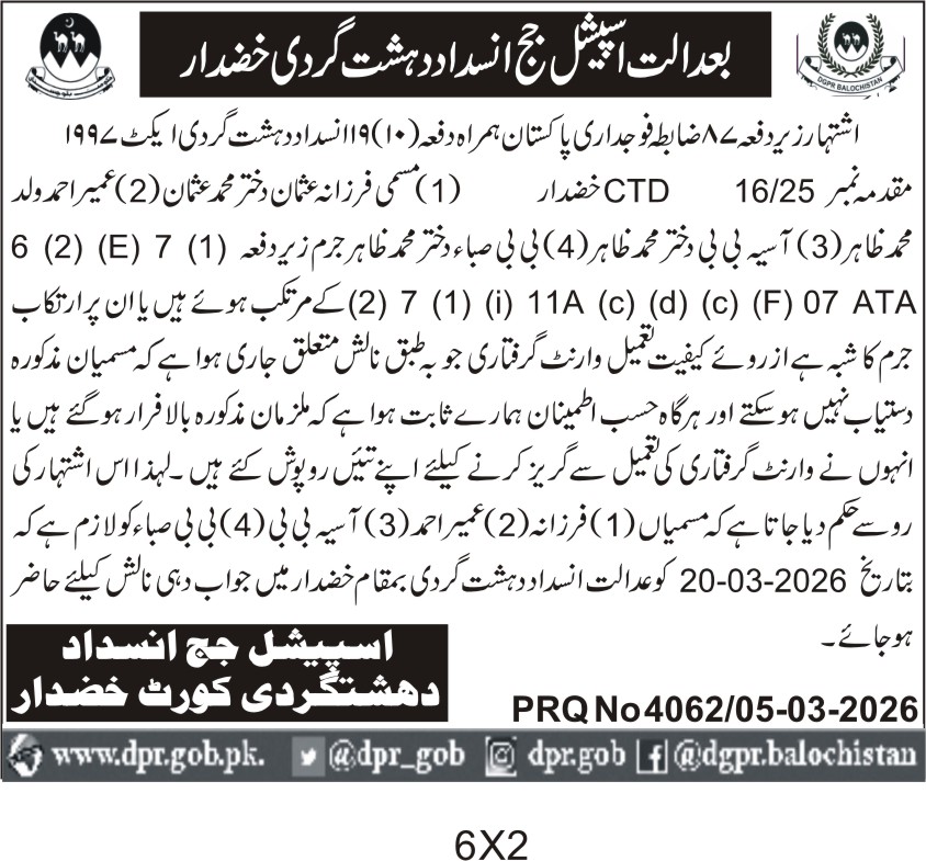 ποΈ Issuing Authority:Special Judge Anti-Terrorism Court Khuzdar