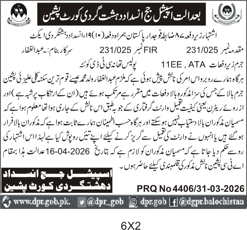Special Judge Anti-Terrorism Quetta Summons and Notice Publication