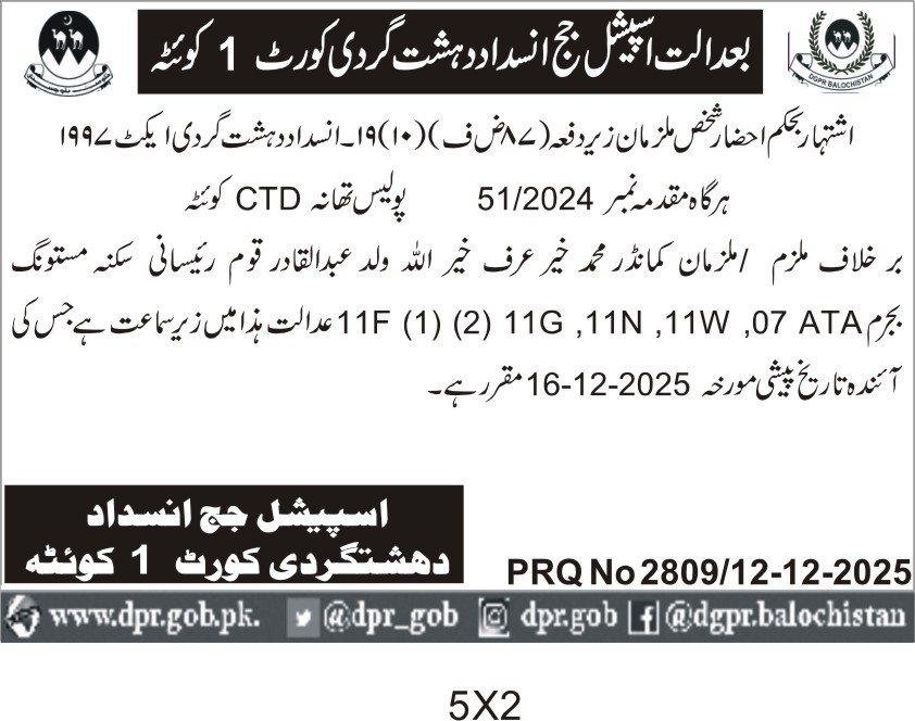 ποΈ Issuing Authority:Special Judge Anti-Terrorism Court 1 Quetta