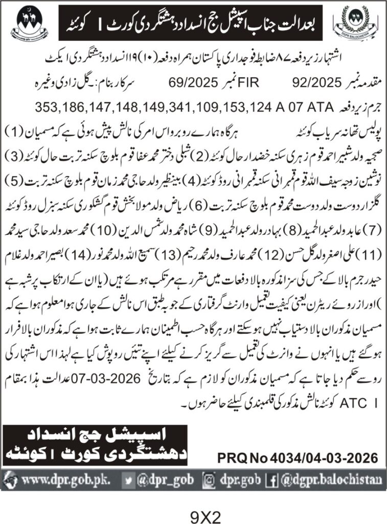 This notice from the Special Judge Anti-Terrorism Court I in Quetta, Balochistan, concerns the attendance of accused individuals in a high-profile terrorism case. The department requires the presence of specific accused persons for hearing related to FIR No. 92/2025 and case No. 69/2025, involving serious charges under ATA and other sections.