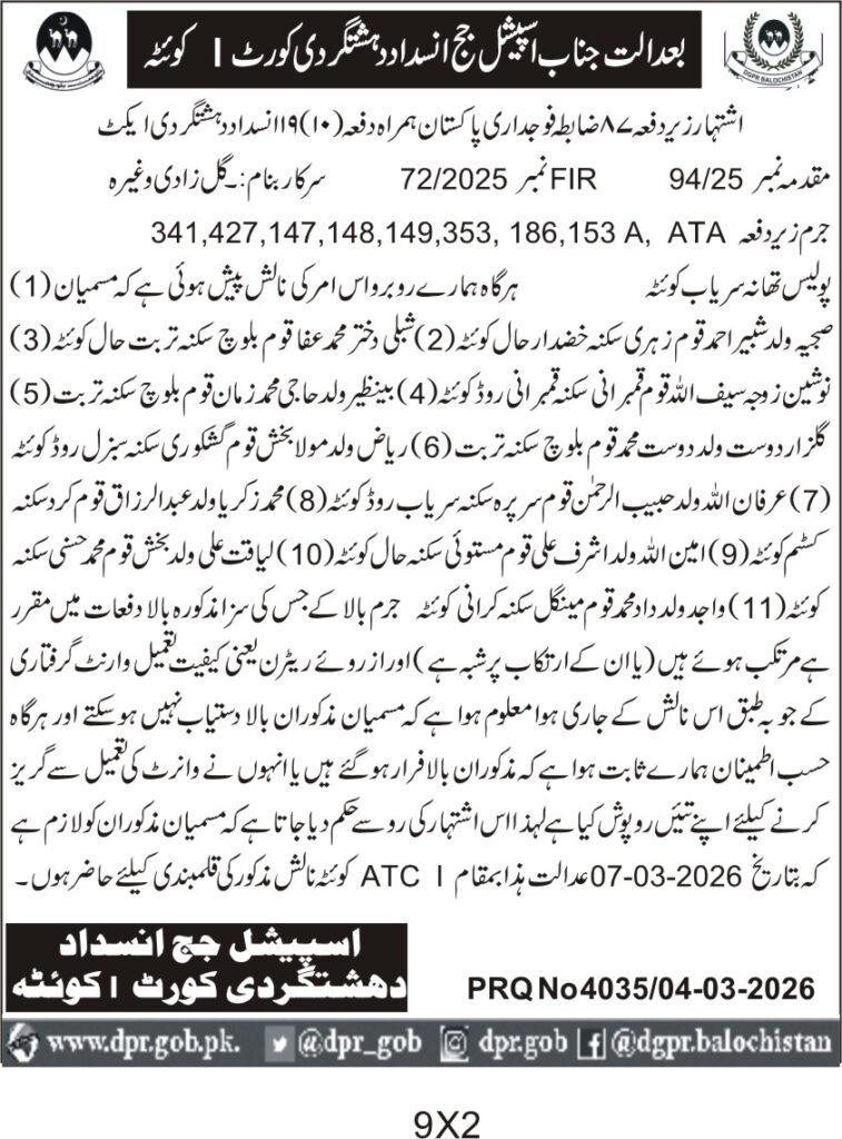 ποΈ Issuing Authority:Special Judge Anti-Terrorism Court Quetta