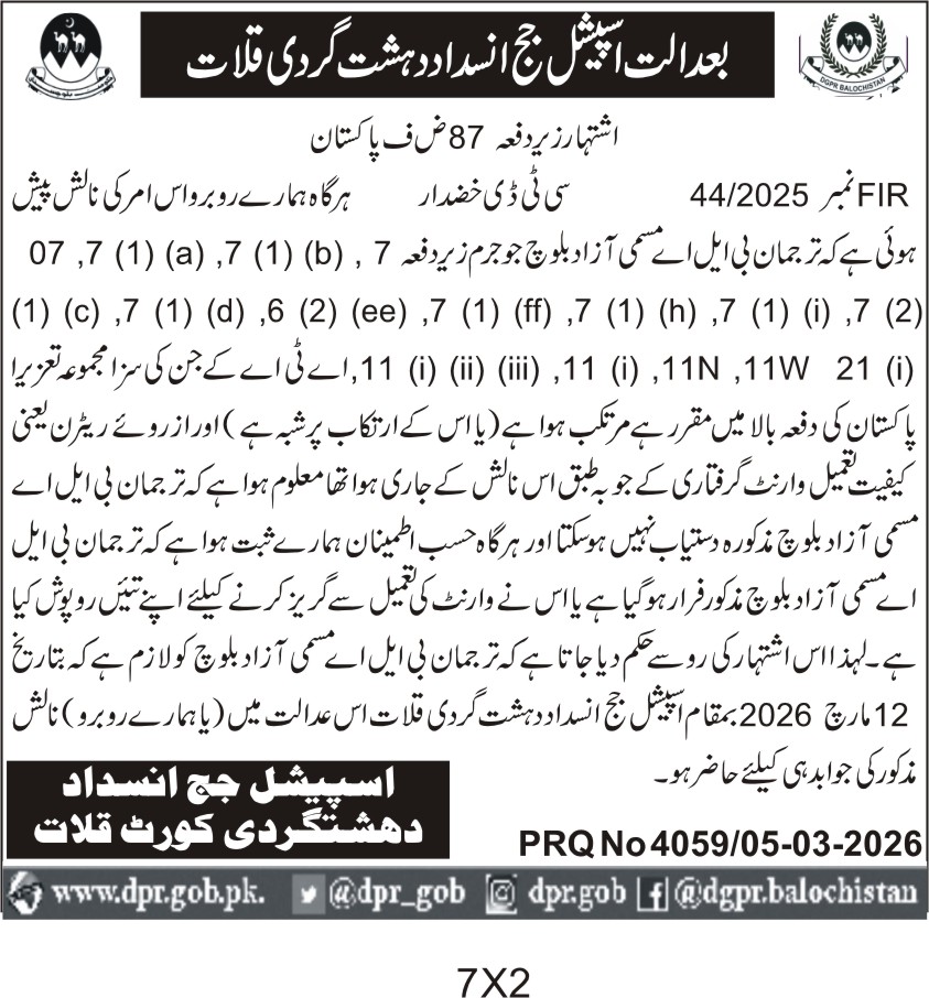 ποΈ Issuing Authority:Special Judge Anti-Terrorism Court Quetta