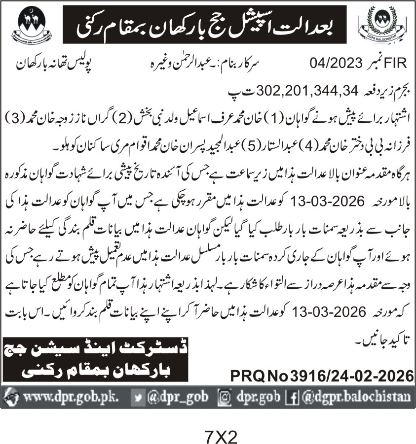This tender notice from the District and Sessions Judge Bar Khan Central in Balochistan invites interested parties for the investigation and hearing of FIR cases involving multiple accused individuals. The scope includes legal proceedings related to FIR numbers 04/2023 and others, with a focus on ensuring proper judicial processes in Bar Khan city.