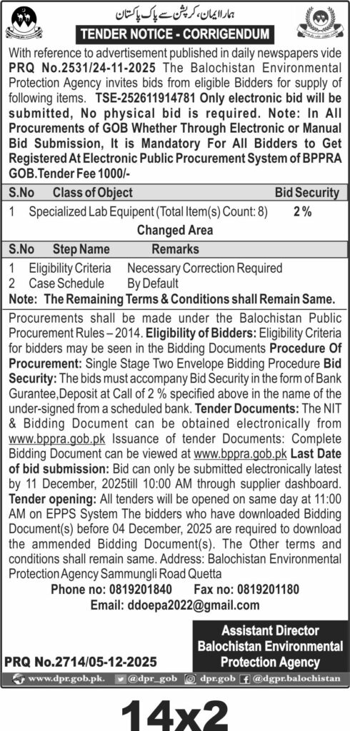 The scope includes supply of 8 specialized lab items with a bid security of 2 percent. Bidding documents are available online at www.bppra.gob.pk and bids must be submitted electronically by 11 December 2025 at 10:00 AM. Tender opening will occur the same day at 11:00 AM on the EPPS system.