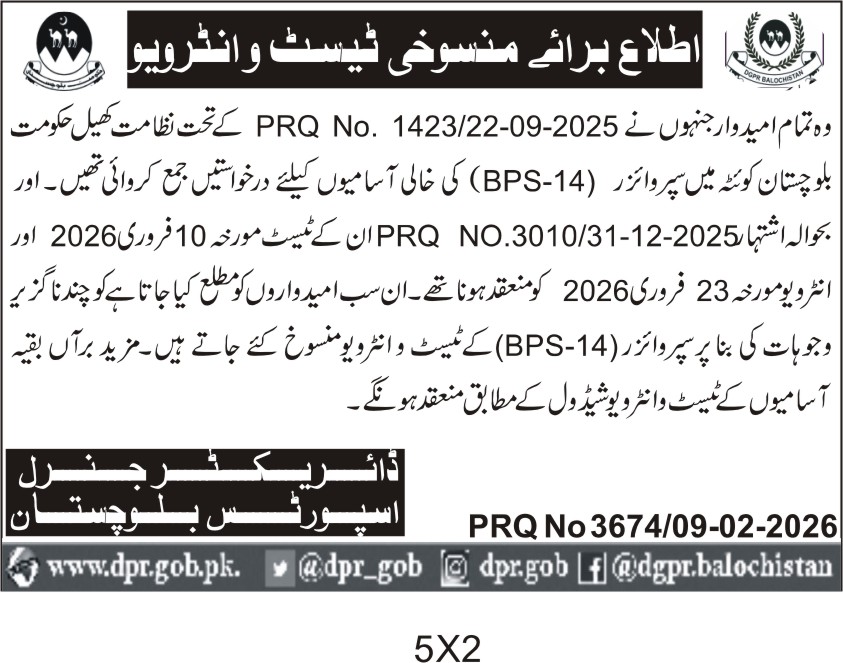 This recruitment drive in Quetta by the Director General Sports Balochistan seeks qualified candidates for the position of Sports Supervisors (BPS-14). The department requires dedicated professionals to fill vacant posts under the government sports system, ensuring the promotion and management of sports activities across the province.