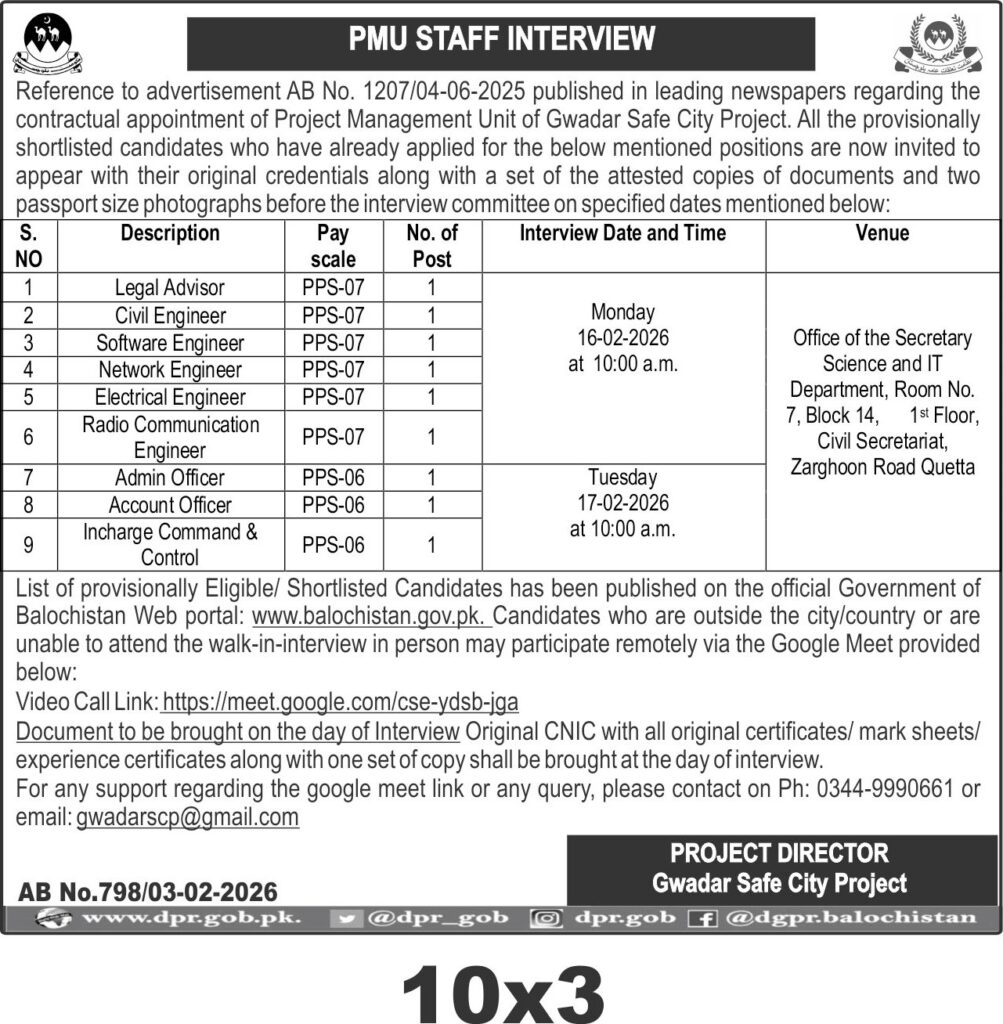 This notice invites shortlisted candidates for interviews for various positions within the Project Management Unit of the Gwadar Safe City Project in Gwadar, Balochistan. The department requires professionals including Legal Advisor, Civil Engineer, Software Engineer, Network Engineer, Electrical Engineer, Radio Communication Engineer, Admin Officer, Account Officer, and Incharge Command & Control. These roles are critical for the successful implementation and management of the Safe City initiative, which aims to enhance security infrastructure in Gwadar.