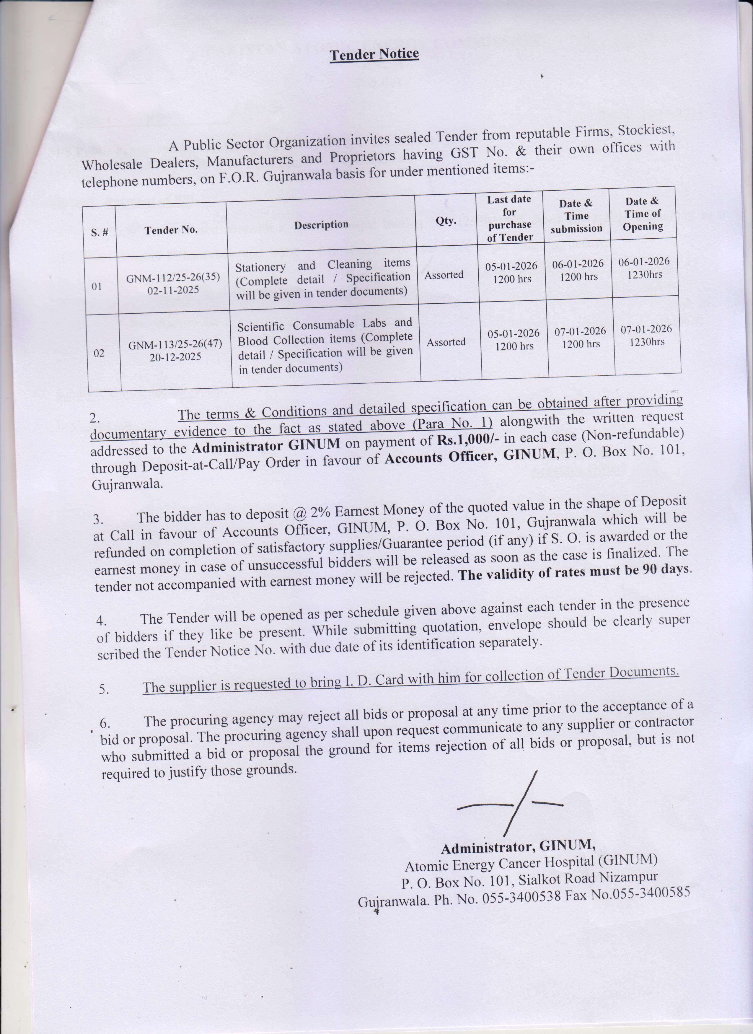 A public sector organization invites sealed tenders for assorted stationery, cleaning items, scientific consumable labs, and blood collection items for Atomic Energy Cancer Hospital Gujranwala. The tenders are on F.O.R. Gujranwala basis with detailed specifications provided in tender documents.