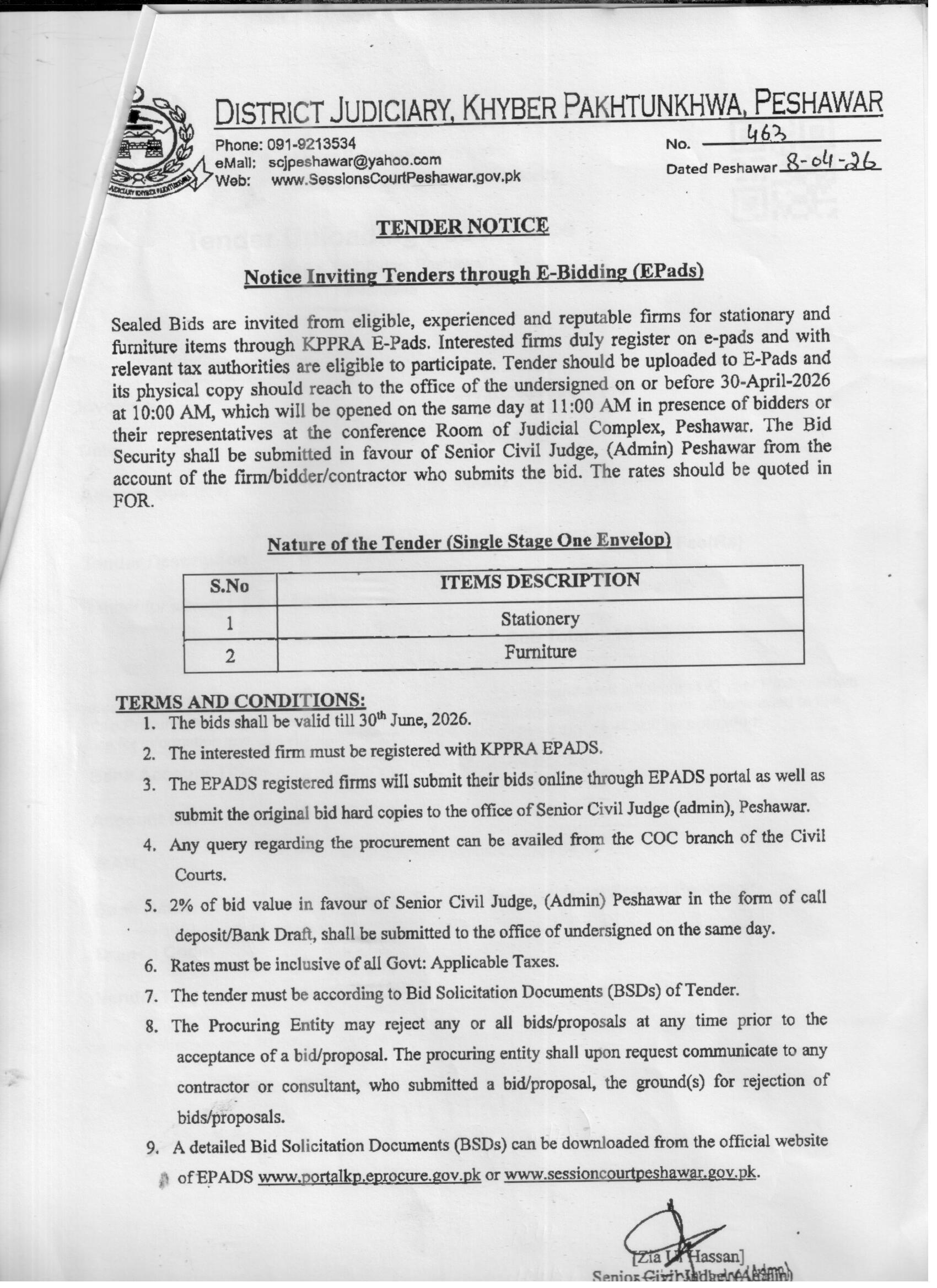 The tender was published on 8th April 2026, with the closing date set for 30th April 2026 at 10:00 AM. Bidders must upload their bids on the E-Pads portal and also submit physical copies to the office of the Senior Civil Judge (Admin) Peshawar. The bids will be opened on the same day at 11:00 AM in the presence of bidders or their representatives at the Judicial Complex conference room.