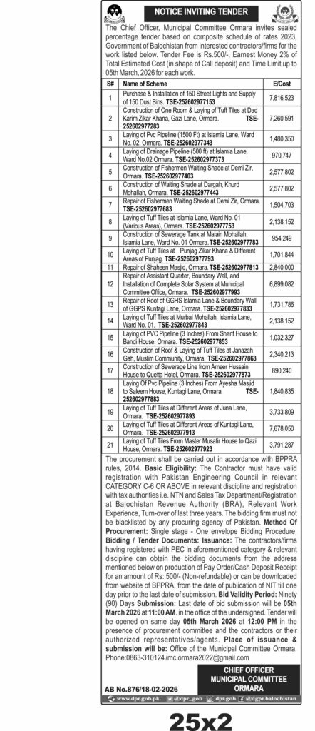 This tender invites contractors in Ormara, Balochistan, to undertake multiple construction and installation projects under the Municipal Committee Ormara. The scope includes the purchase and installation of 150 street lights along with the supply of 150 dust bins, laying of PVC and drainage pipelines, construction of fishermen waiting shades, repair works on community buildings, and installation of a complete solar system at the Municipal Committee office. These works require expertise in civil construction, electrical installations, and pipeline laying, all within the urban and semi-urban settings of Ormara.