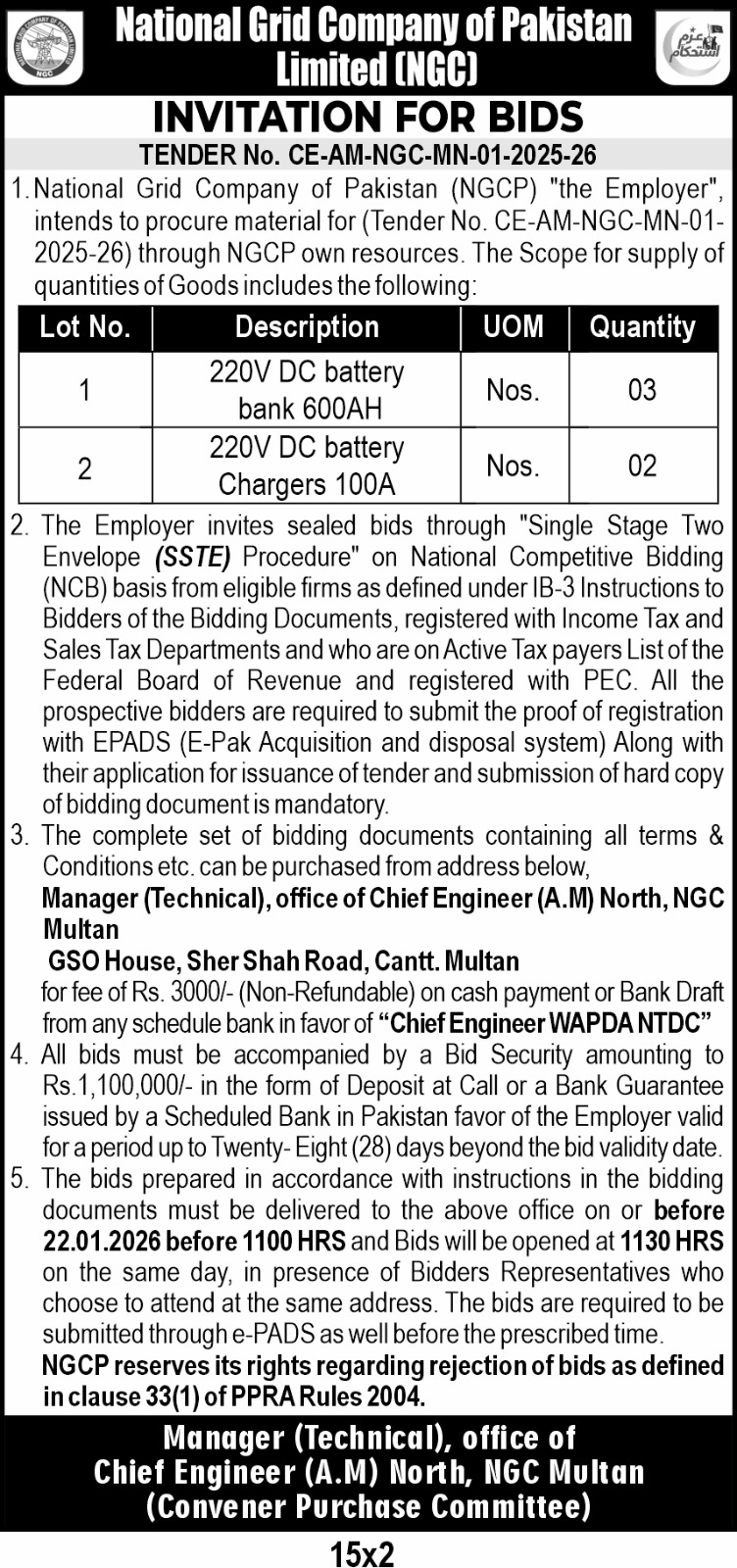 The scope involves supplying high-quality batteries and chargers designed to meet the rigorous demands of power infrastructure. These items will be used in key grid installations in Multan, requiring adherence to strict technical specifications to ensure durability and performance under continuous load conditions. Suppliers must be prepared to meet the technical and logistical challenges of delivering and supporting these electrical components in a timely manner.