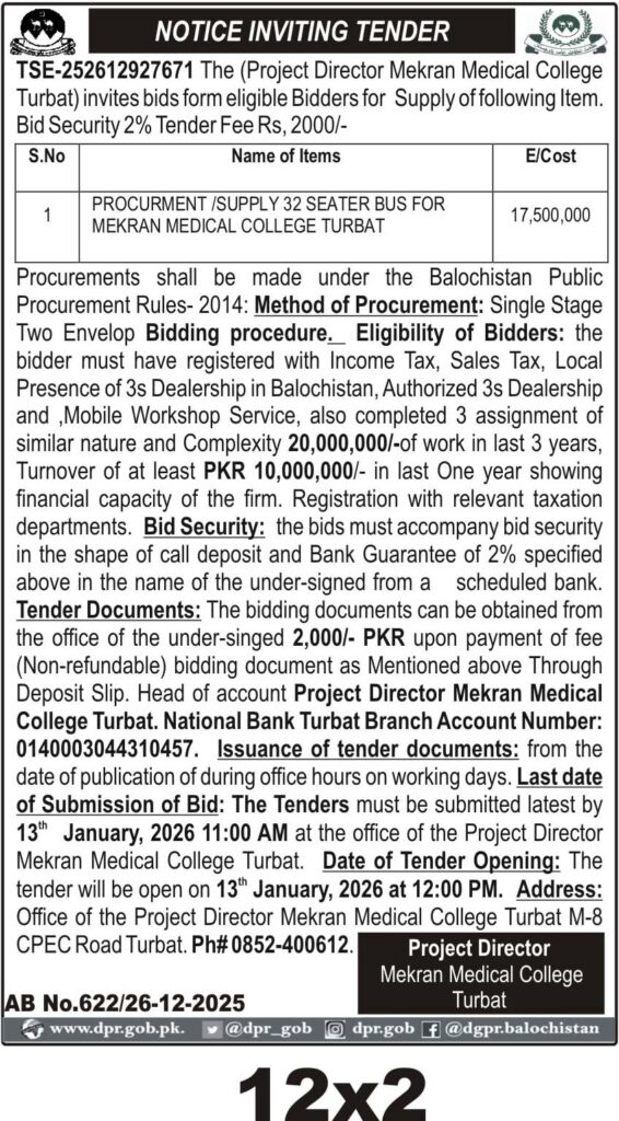 This tender invites bids for the supply of a 32 seater bus for Mekran Medical College in Turbat under the vehicles and auto parts category. The procurement is conducted in Turbat city with a focus on vehicle supply. The tender follows the Balochistan Public Procurement Rules 2014 with a single stage two envelope bidding method. The scope includes procurement of one 32 seater bus for the college with an estimated cost of PKR 17,500,000. Bidders must be registered with relevant tax authorities and have local dealership presence in Balochistan. Eligibility requires completion of similar assignments worth PKR 20,000,000 in the last three years and a turnover of at least PKR 10,000,000 in the last year. Tender documents are available for PKR 2,000 from the Project Director's office. The last date for bid submission is 13th January 2026 at 11:00 AM, with tender opening at 12:00 PM the same day. Contact details include phone number 0852-400612 for further inquiries.
