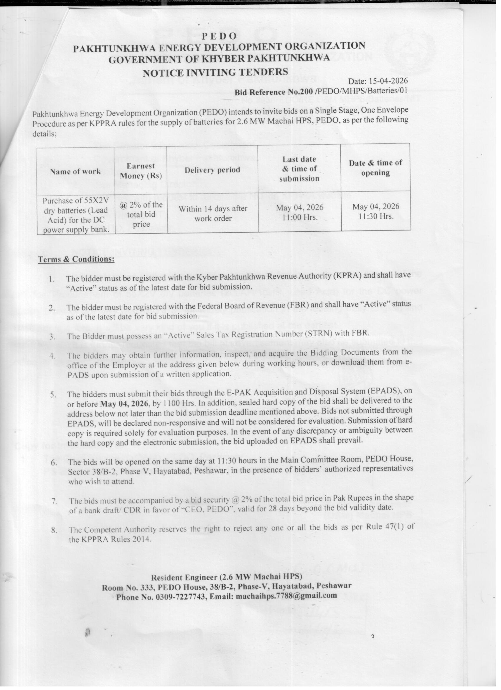 The Pakhtunkhwa Energy Development Organization (PEDO) is procuring 55X2V dry lead acid batteries specifically for the DC power supply bank of the 2.6 MW Machai Hydropower Station located in Peshawar, Khyber Pakhtunkhwa. This procurement is critical for ensuring reliable power backup and operational stability at the hydropower site.