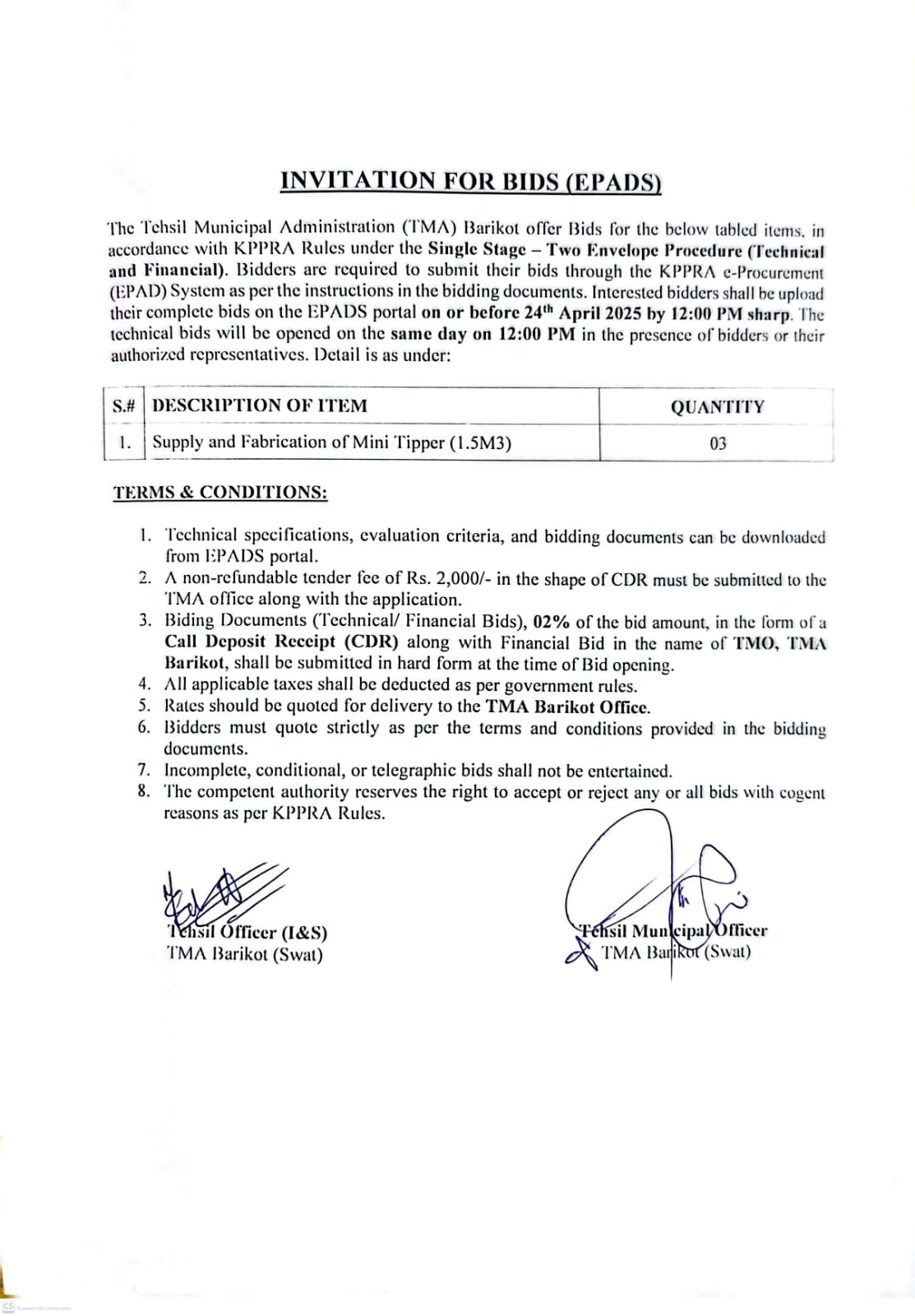 Pro-Tip: Carefully review the tender documents on the EPADS portal for detailed technical specifications and evaluation criteria. Pay special attention to the Call Deposit Receipt requirements and ensure the CDR is in the name of TMO, TMA Barikot to avoid disqualification.
