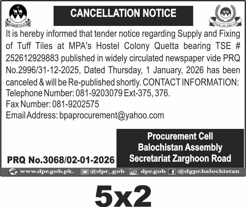 The submission deadline is set for 8th January 2026, with bids opening shortly after. Interested parties must submit their sealed bids to the Procurement Cell at the Balochistan Assembly Secretariat on Zarghoon Road, Quetta. Late submissions will not be entertained.