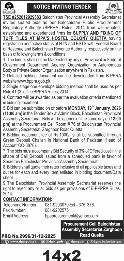 The submission deadline is set for 19th January 2026 at 11:00 am, with bids to be submitted in sealed envelopes at the Admin Block, Balochistan Provincial Assembly Secretariat. Bid opening will follow at 12:00 pm in Procurement Cell Room #76 at the same location on Zarghoon Road, Quetta.