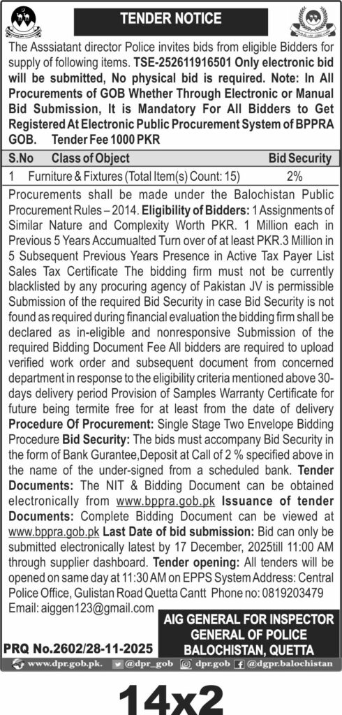 Tender documents are available electronically at www.bppra.gob.pk. Bids must be submitted electronically by 17 December 2025 at 11:00 AM and will be opened the same day at 11:30 AM. Contact details and submission instructions are provided by the Police Department Quetta.