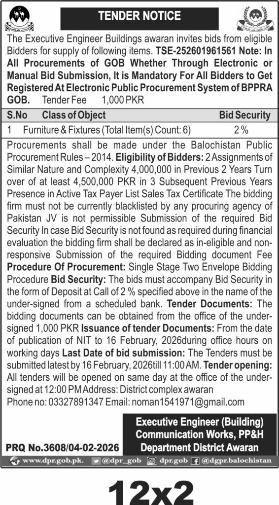 This tender invites bids for the supply of furniture and fixtures in District Awaran, Balochistan, under the Communication Works, Public Parks & Horticulture Department. The procurement focuses on furnishing requirements essential for government offices and facilities, ensuring quality and durability suitable for the local environment.