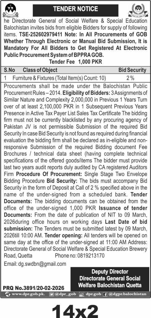 The submission deadline is set for 09 March 2026 at 10:00 AM, with the tender opening scheduled the same day at 11:00 AM. Bids must be submitted in sealed envelopes to the Directorate General of Social Welfare and Special Education office located on Brewery Road, Quetta. Tender documents can be obtained from the same office upon payment of a PKR 1,000 fee.