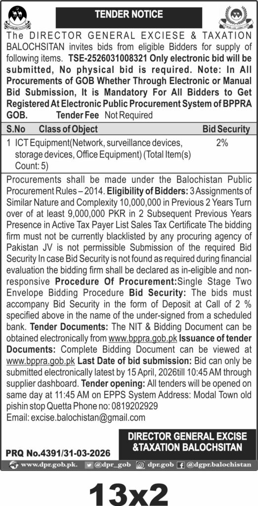 This tender invites bids from eligible suppliers in Quetta for the supply of ICT equipment including network devices, surveillance systems, storage devices, and office equipment. The procurement is managed by the Director General Excise and Taxation Balochistan, focusing on enhancing the technological infrastructure within the department.