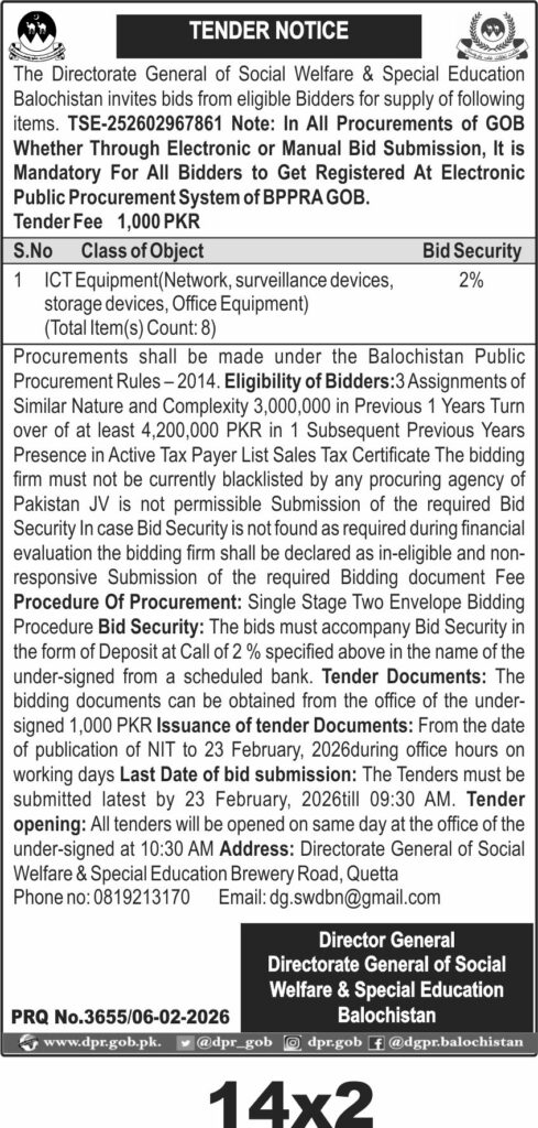 The submission deadline is set for 23 February 2026 at 09:30 AM, with bid opening scheduled the same day at 10:30 AM. Bidders can obtain tender documents from the Directorate General of Social Welfare & Special Education office on Brewery Road, Quetta, during office hours until the closing date. Tender fee is PKR 1,000.