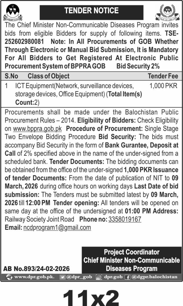 This tender invites bids for the supply of ICT equipment including network devices, surveillance devices, storage devices, and office equipment for the Chief Minister Non-Communicable Diseases Program in Quetta, Balochistan. The procurement falls under IT & Office Equipment and Electronics & Appliances categories, reflecting the need for modern technology to support healthcare initiatives in the region.