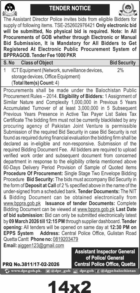 The deadline for electronic bid submission is set for 09 March 2026 at 12:15 PM, with bid opening scheduled the same day at 12:30 PM via the Electronic Public Procurement System (EPPS). Bidders must register on the BPPRAGOB portal to participate. The physical address for correspondence is the Central Police Office, Gulistan Road, Quetta Cantt.
