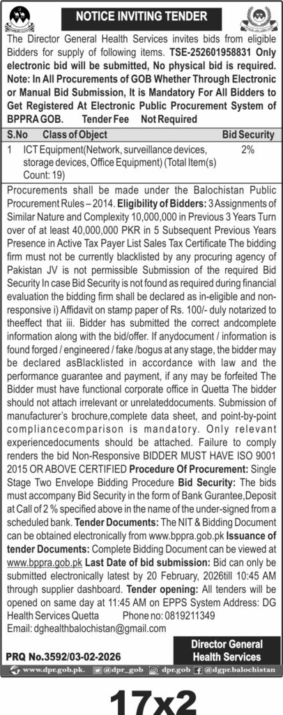 This tender invites bids from eligible suppliers for the supply of ICT equipment including network devices, surveillance devices, storage devices, and office equipment in Quetta under the Director General Health Services, Balochistan. The procurement falls under IT & Office Equipment and Electronics & Appliances categories, targeting advanced technological solutions to enhance operational efficiency in the health sector.