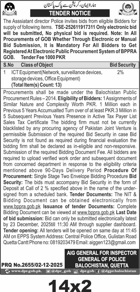 Bid submission deadline is 23 December 2025 at 11:30 AM with opening at 11:45 AM same day. Eligibility criteria include no blacklisting and joint ventures allowed. Contact details and submission instructions are provided for the Assistant Director Police Quetta office.