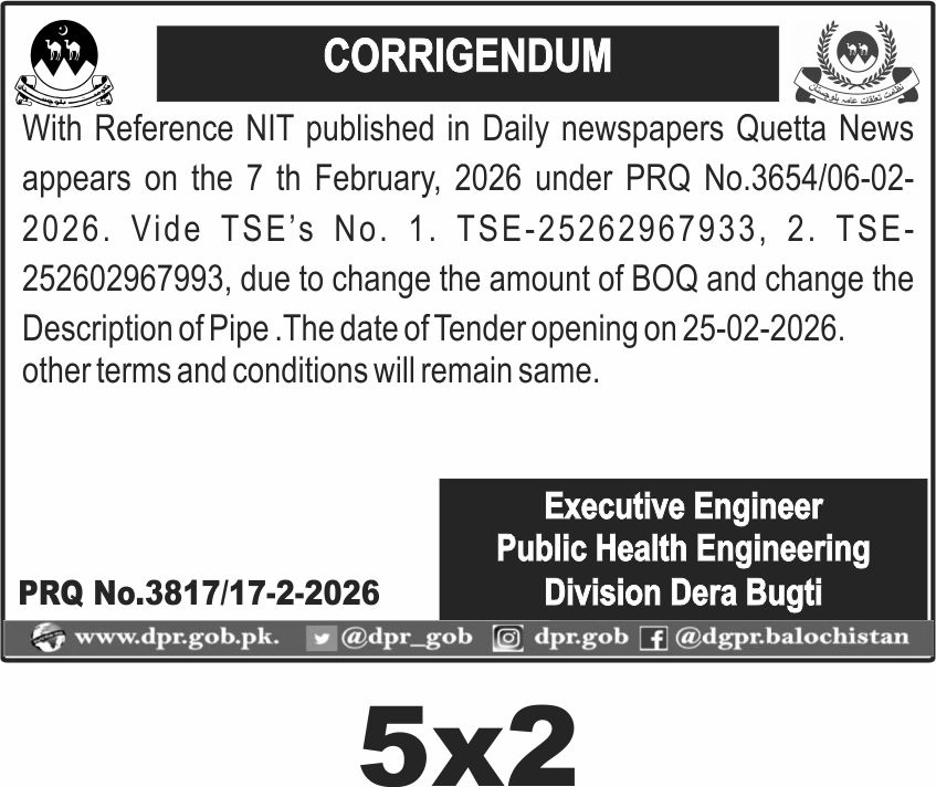 The submission deadline is set for 25th February 2026, with the tender opening scheduled on the same day. Bids must be submitted in sealed envelopes at the office of the Executive Engineer, Public Health Engineering Division, Dera Bugti. Late submissions will not be entertained.