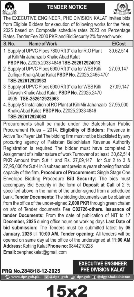 This tender invites bids for supply and installation of UPVC pipes and RO plant in Kalat city under PHED. The procurement covers plumbing and civil works for water supply infrastructure in Kalat.