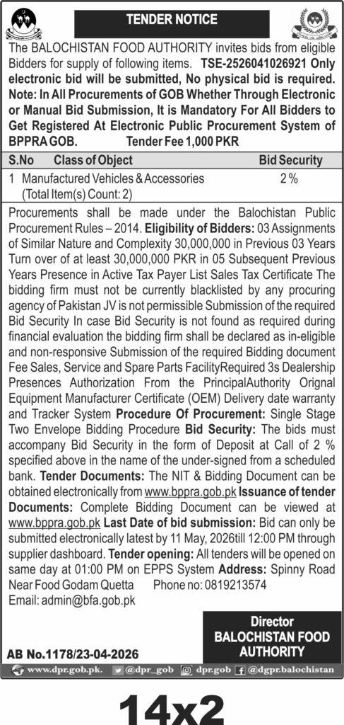 The Balochistan Food Authority in Quetta is procuring manufactured vehicles and accessories under the Balochistan Public Procurement Rules 2014. This tender invites eligible bidders to supply two items classified as manufactured vehicles and accessories. The procurement is conducted through a single stage two envelope bidding procedure with electronic bid submission only, emphasizing transparency and efficiency.