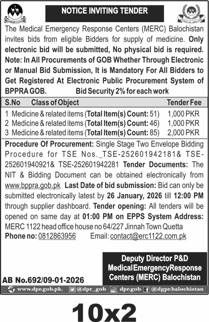 The procurement involves supplying a total of 182 medicine items across three categories, reflecting the urgent healthcare needs of the local population. The medicines will be delivered to the MERC head office located at Jinnah Town, Quetta. Given the sensitive nature of medical supplies, bidders must ensure compliance with quality standards and timely delivery to maintain uninterrupted emergency response capabilities.