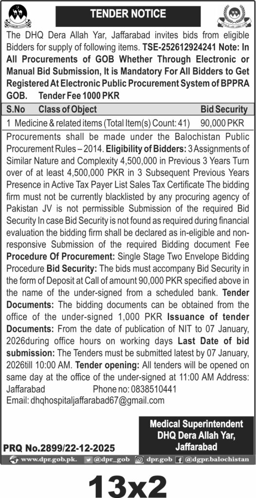 DHQ Dera Allah Yar Jaffarabad invites bids for supply of medicines and related items under Balochistan Public Procurement Rules. The tender covers 41 items with a bid security of 90,000 PKR and a tender fee of 1,000 PKR. The procurement is for medical and pharmaceutical supplies in Dera Allah Yar city.
