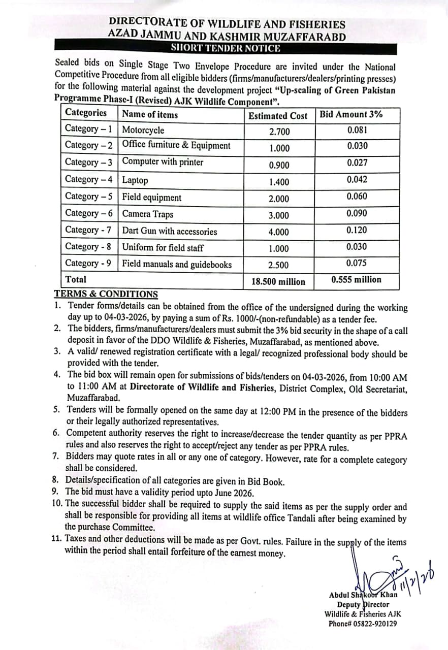 Submission deadline is set for 4th March 2026, with bid opening scheduled the same day at 12:00 PM at the Directorate of Wildlife and Fisheries, District Complex, Old Secretariat, Muzaffarabad. Bidders must submit sealed bids between 10:00 AM and 11:00 AM. Tender forms are available at the office upon payment of a non-refundable fee of Rs. 1000.
