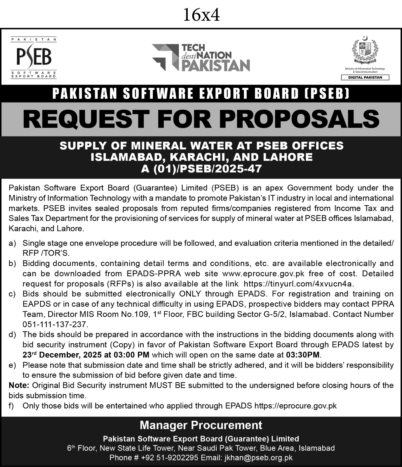 Pakistan Software Export Board (PSEB) invites sealed proposals from reputed firms/companies registered with Income Tax and Sales Tax Departments for the supply of mineral water at its offices located in Islamabad, Karachi, and Lahore. The procurement aims to ensure continuous provision of mineral water to support office operations across these locations.