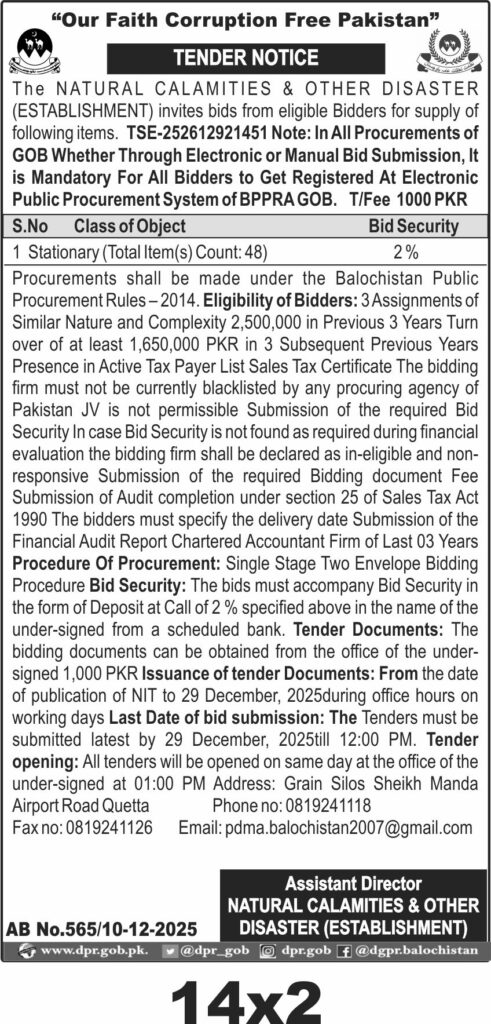 The Natural Calamities & Other Disaster Establishment in Quetta invites bids for supply of stationary items under Balochistan Public Procurement Rules. The tender covers procurement of 48 stationary items with required bid security of 2 percent. Bidders must meet eligibility criteria including prior assignments, turnover, tax registration, and no blacklisting. Submission deadline is 29 December 2025 by 12:00 PM with opening at 1:00 PM same day at Grain Silos Sheikh Manda Airport Road Quetta. Tender documents are available for 1000 PKR fee and bids must include deposit bid security. Contact details include phone 0819241118 and email pdma.balochistan2007@gmail.com.