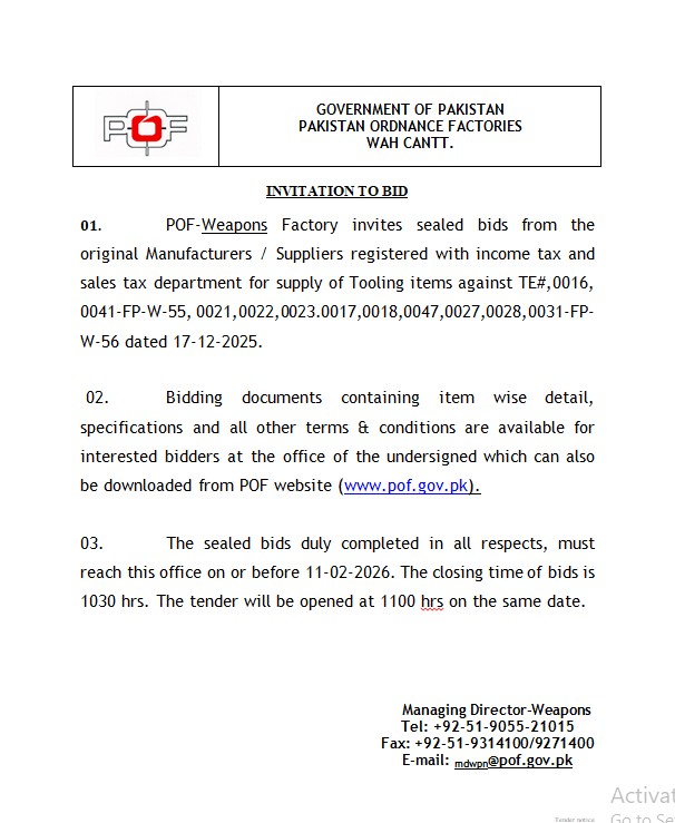 The sealed bids must reach the office of the Managing Director-Weapons, Pakistan Ordnance Factories, Wah Cantt, by 11th February 2026 at 10:30 AM. The technical and financial bids will be opened on the same day at 11:00 AM. Interested parties can obtain bidding documents from the POF office or download them from the official website.