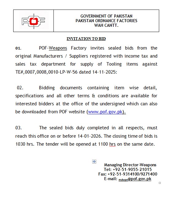 This tender invites sealed bids from original manufacturers and suppliers registered with income tax and sales tax departments for the supply of tooling items to Pakistan Ordnance Factories, Wah Cantt. Bidding documents with detailed specifications are available at the office and online.