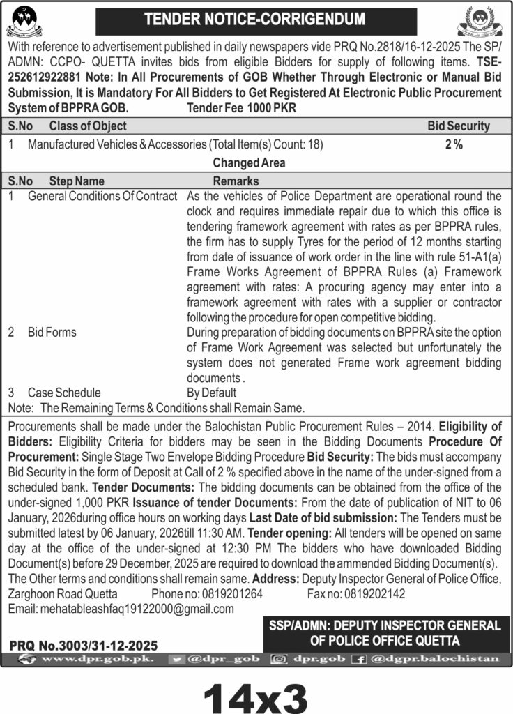 The submission deadline is set for 06 January 2026 at 11:30 AM, with bid opening scheduled the same day at 12:30 PM. Bids must be submitted physically at the Deputy Inspector General of Police Office, Zarghoon Road, Quetta. Interested bidders can obtain tender documents during office hours until 06 January 2026.