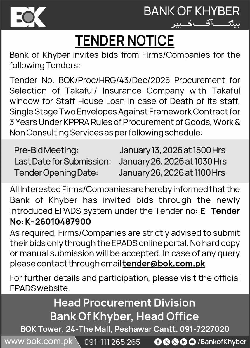 The submission deadline is set for January 26, 2026, at 10:30 AM, with bid opening scheduled the same day at 11:00 AM. All bids must be submitted online via the EPADS system; no hard copies will be accepted. The Bank of Khyber's Head Office is located at BOK Tower, 24-The Mall, Peshawar Cantt, where the procurement division operates.