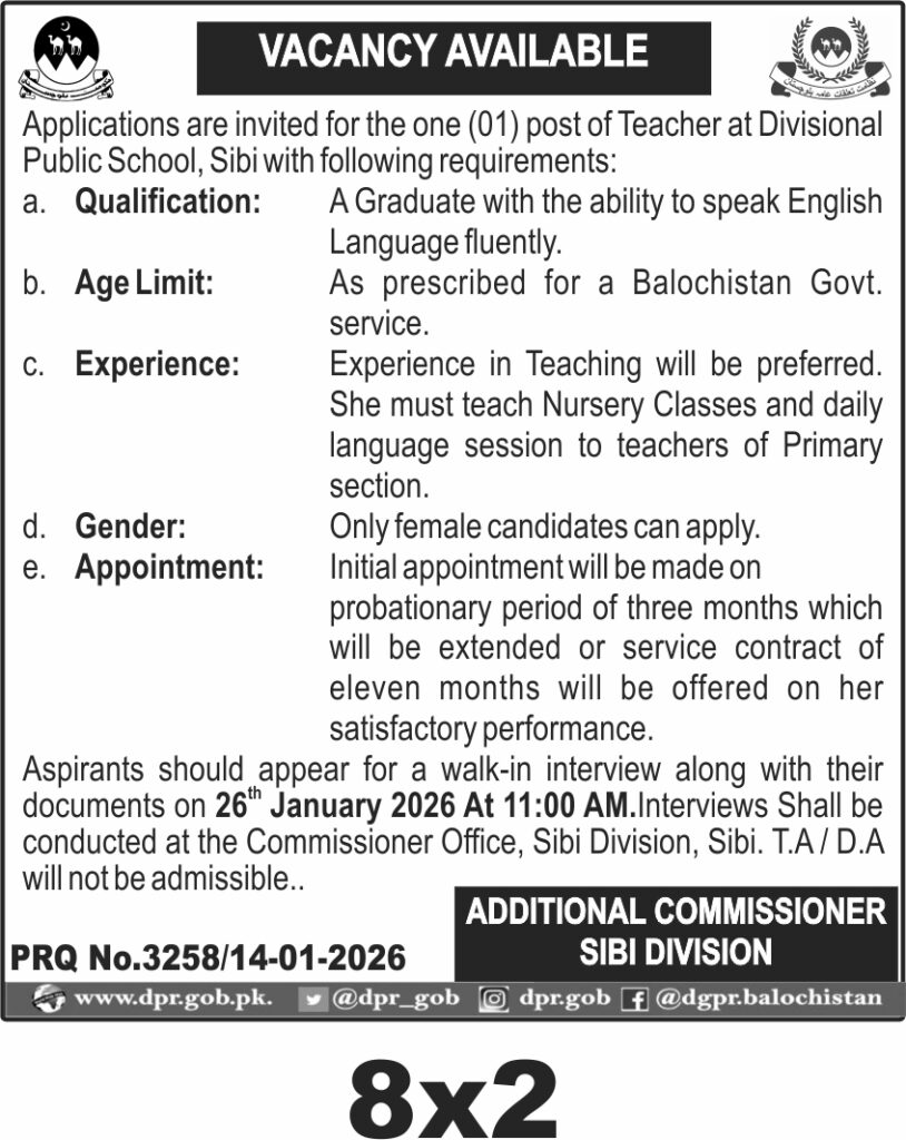 This recruitment opportunity is announced by the Additional Commissioner Sibi Division for the position of Teacher at Divisional Public School, Sibi, Balochistan. The role focuses on teaching Nursery classes and conducting daily language sessions for Primary section teachers, emphasizing English fluency and educational development.