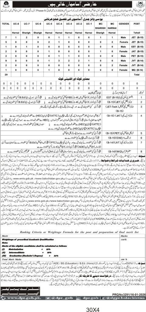 Teaching Staff Recruitment for Various Posts in District Harnai Balochistan