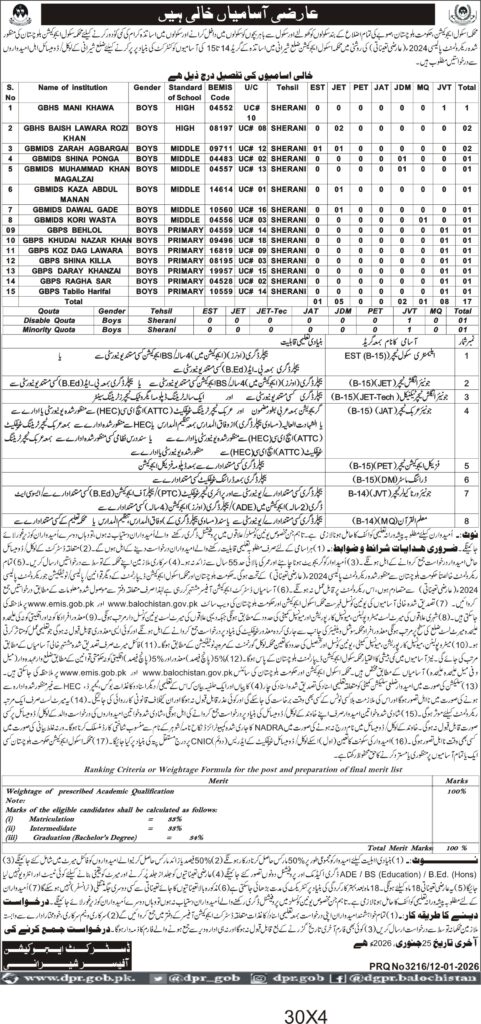 The recruitment covers multiple schools across Sherani, requiring candidates to meet specific academic qualifications such as BS Education, B.Ed, and relevant teaching certifications recognized by HEC and ATTC. The positions demand expertise in different subjects and teaching grades, reflecting the diverse educational needs of the district's student population.