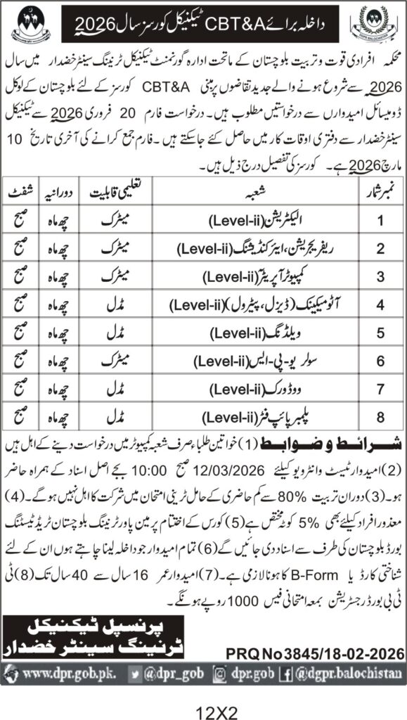 Technical Training Courses CBT&A for Balochistan Local Domiciles 2026
