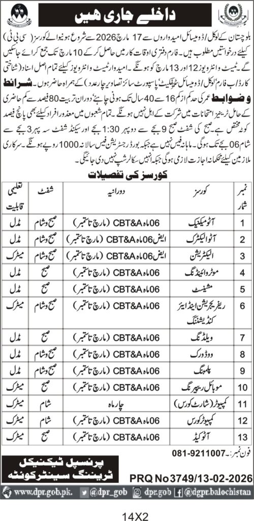 This tender invites applications from local individuals in Quetta for a series of professional technical training courses offered by the Balochistan Provincial Technical Training Center. The courses cover a wide range of skills including automotive mechanics, electrical work, welding, motor winding, refrigeration, and computer skills. The training spans six months from March to September 2026, with sessions scheduled in the morning and evening to accommodate different participants. The center requires candidates aged between 16 and 40 years with at least 80% attendance during training and a minimum 5% quota reserved for disabled persons.