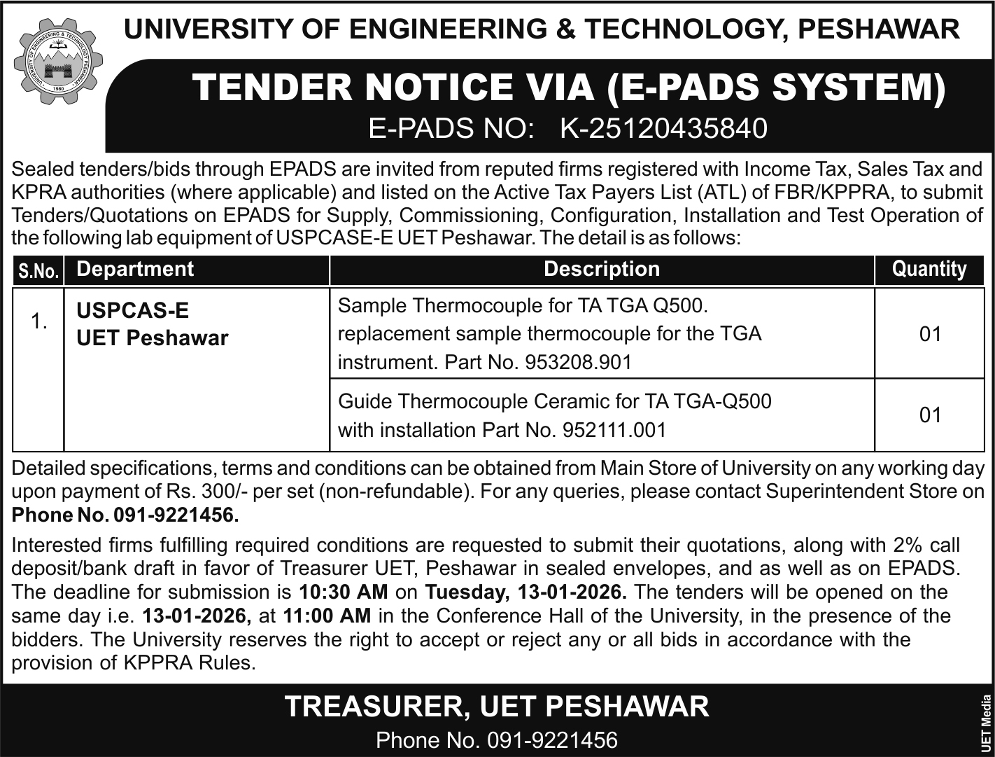 The tender requires submission of quotations along with a 2% call deposit/bank draft in favor of Treasurer UET, Peshawar. Detailed specifications and terms are available at the university's main store upon payment of Rs. 300 per set. The tender closing is on 13-01-2026 at 10:30 AM, with opening at 11:00 AM in the university conference hall.