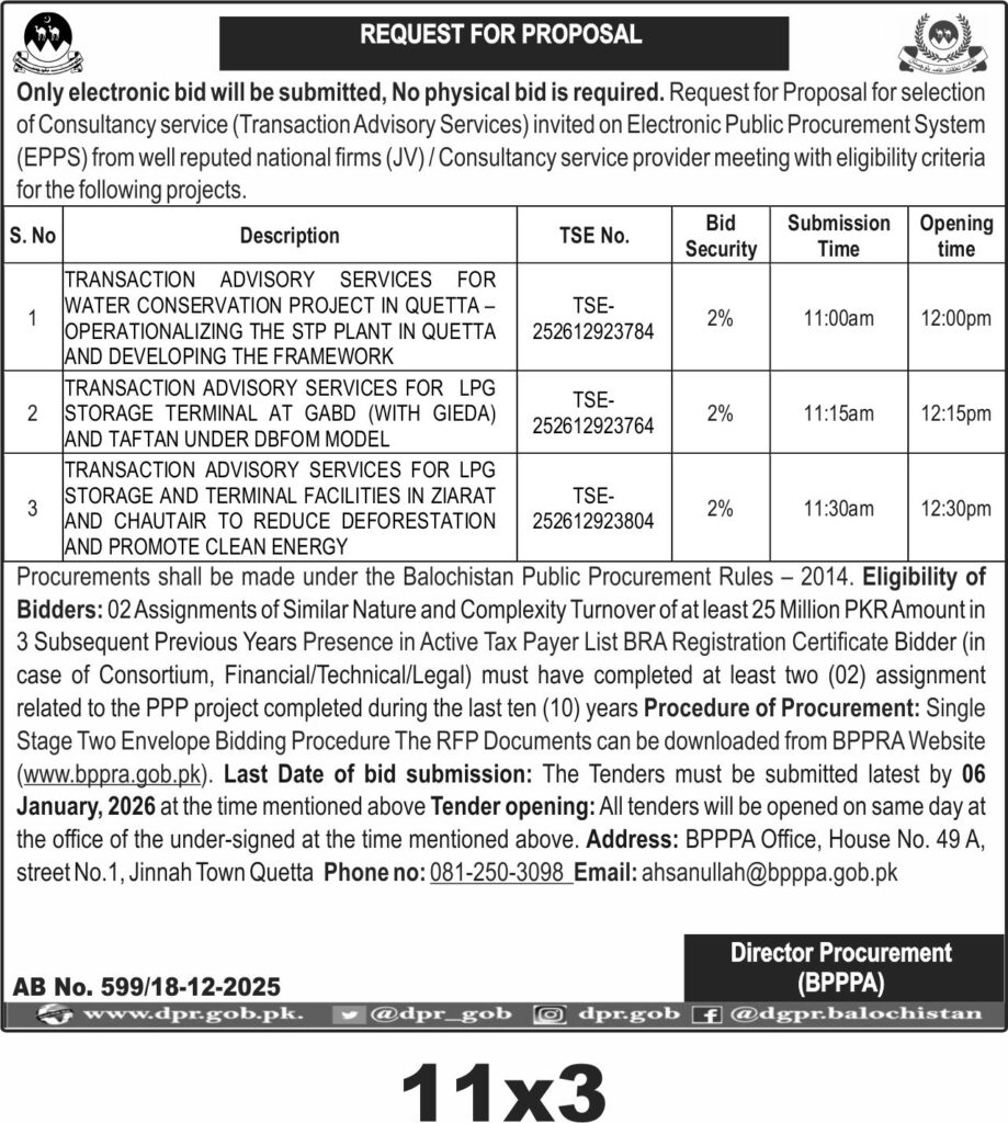The consultancy assignments require firms with relevant experience, turnover of at least 25 million PKR, and active tax registration. Bidders must have completed similar PPP projects in the last ten years. The RFP documents are available on the BPPRA website and bids must be submitted electronically by the specified deadline.