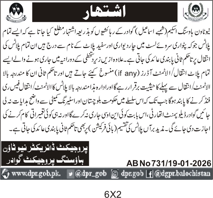 Transfer and Suspension of All Plates in Gwadar New Town Housing Scheme